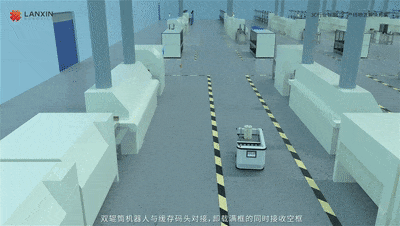 堆高型无人叉车从货架上取出整托货物,堆放在库边;搬运型无人叉车将货物搬运至成品发料区。