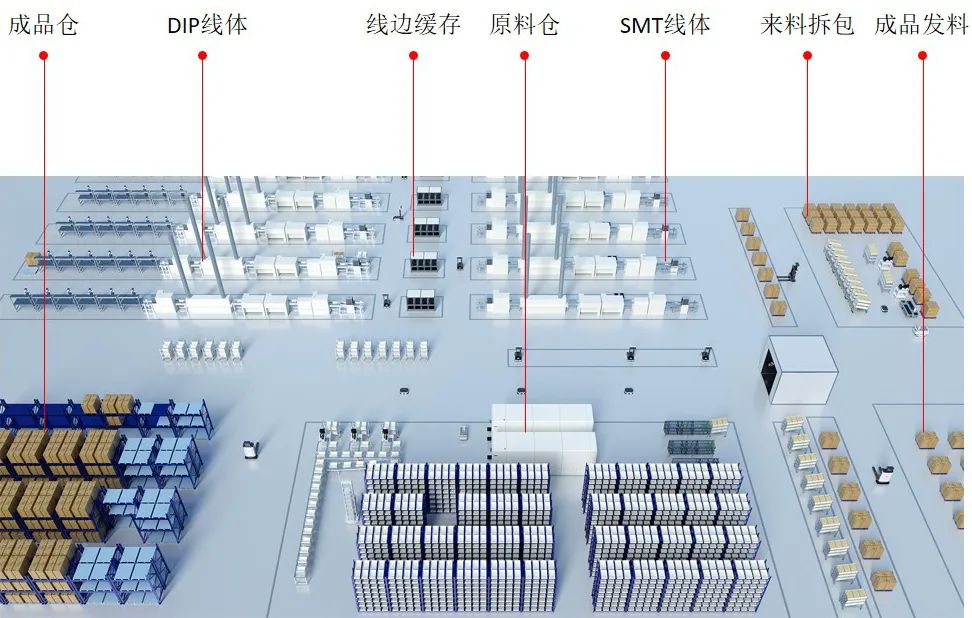 SMT上下料机器人从线边缓存仓取出二次面加工完成的PCB满箱,送至DIP线体的上板机的下层,再从上板机的上层回收空箱送入线边缓存仓。