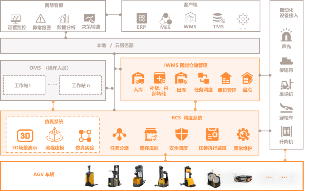 1.AGV调度系统(RCS):这是AGV的“智慧大脑”,能实时监控、调度各类AGV车辆,确保其高效、有序地执行任务。