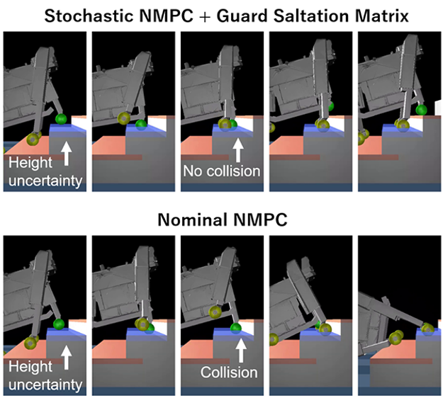 腿式机器人需在周围环境感知存在不确定性时采取安全行动。传统的基于模型的方法难以将这些不确定性有效地纳入运动生成中。因此,工程师们必须花费大量精力调整各种控制参数以保证安全。在本研究中,索尼集团开发了一种方案,通过使用防护跳跃矩阵,考虑环境的不确定因素来预测未来运动的不确定性。将该方案与基于优化的运动生成相结合,机器人即使在对周围环境的测量不完善的情况下,也能生成安全的全身运动(例如,腿部动作和接触位置)。