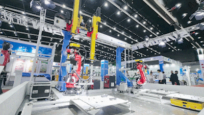 展会现场,新松移动机器人将物料精准运到指定接驳位,再由新松工业机器人将物料拣选抓取放到上料工位,新松桁架机器人抓取物料为机床上料,再将加工后的成品放到下料台,由工业机器人将成品抓取到下料托盘进行码垛,最后由移动机器人完成成品托盘的流转。