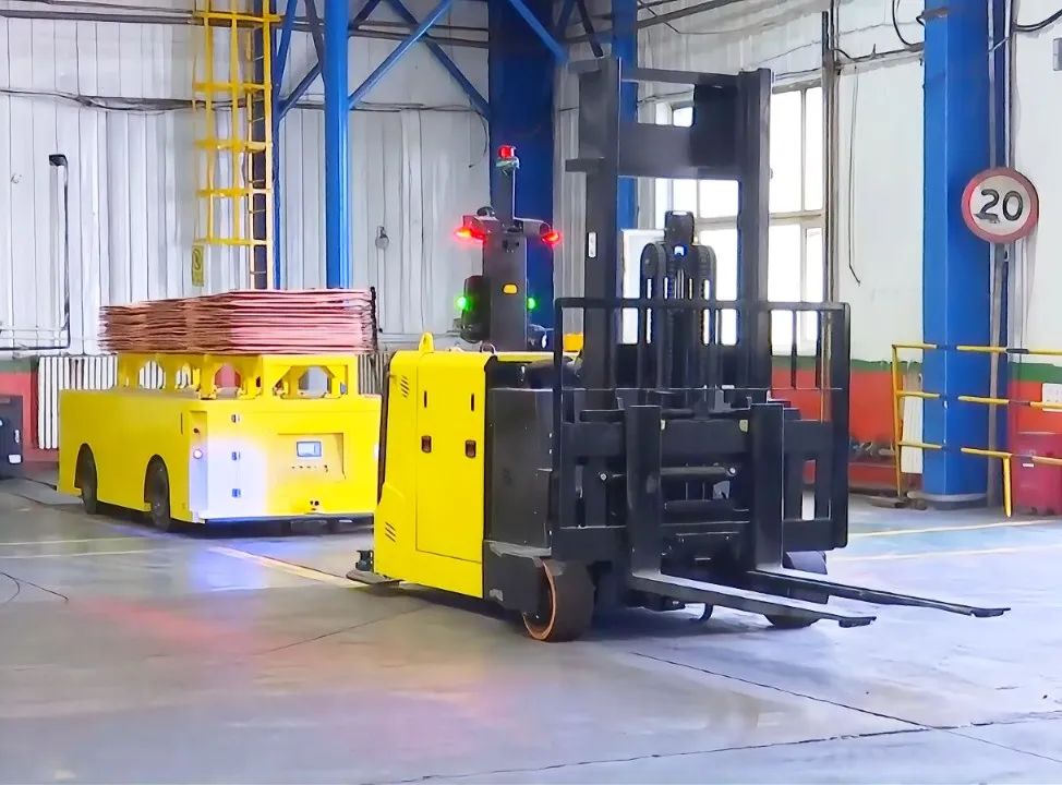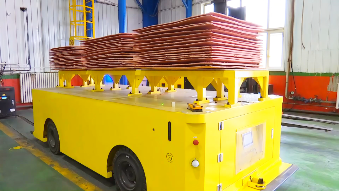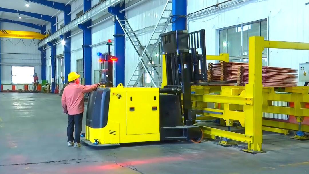 历经一年精心筹备,投资408万元的 AGV 电铜自动转运系统于9月初试运行,系统包含两台转运AGV小车和一台AGV叉车,是自动化系统中的关键一环。转运AGV小车采用四驱电机驱动,设计承载能力为10吨,动力强劲、行动灵活,在磁条的导引下,它们能出色地完成电铜从电解车间到成品库的转运任务。这种转变带来诸多优势:节省了人力,过去该项作业需要两台叉车和六名叉车司机三班倒作业;消除了人工叉车倒运存在的安全隐患;省掉堆放工序,直接在周转架上对阴极铜进行打包,且24小时连续生产。