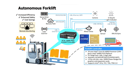 借助 Vecow ECX-3200/3100 等嵌入式计算机,无人驾驶叉车可以降低劳动力成本、提高效率并优化工作流程。