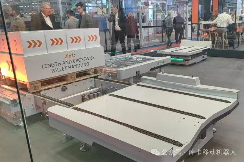 在TRAPO展台,KMP 1500P搭载链式输送机与辊筒线对接,展示高效运输和对接能力