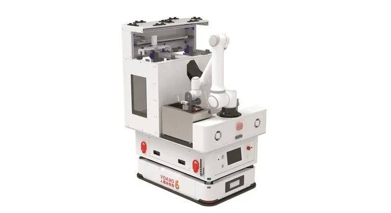 “这是一台复合机器人,内部空间都被安排得满满当当。”在欧铠机器人车间,研发人员正在对一台准备交付的复合机器人进行测试,何建忠介绍,复合机器人就是将AGV+机械手臂两者成熟的技术产品相结合,具备了更精确定位“行走”的功能,其搭载的机械手臂实现了在各种工况下的定制作业,可以和机械臂、3D视觉镜头协作,完成精度要求±0.5毫米以内的CNC机台上下料,一台复合机器人可以与26台CNC自动上下料。再结合ERP/MES等信息系统指令,复合机器人与信息系统结合运作。调度人员通过系统,向复合机器人下达物料、上下料的指令,车间智能化也由此形成。