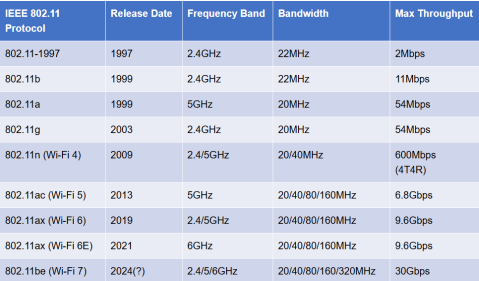 • 802.11n(Wi-Fi 4)支持2.4GHz和5GHz两个频段,速度为72-600Mbps,通过MIMO技术提升数据传输速率;