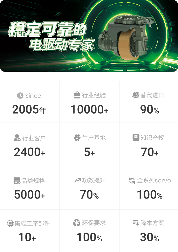 凤凰动力致力于提供多元化的AGV核心零部件产品。包括卧式/立式驱动轮、卧式/立式舵轮、电转向轮、差速舵轮组、AGV专用高精密脚轮、低压伺服电机、伺服减速电机、伺服驱动器、专用连接器和高精密行星减速机。这些产品旨在确保AGV在各种应用场景中都能实现高效、稳定的运行。选择凤凰动力,为您的AGV项目提供强大支持。