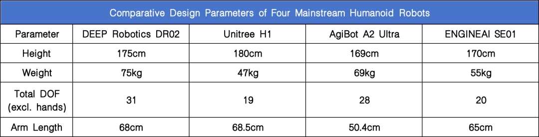 DEEP Robotics DR02 和 ENGINEAI SE01 采用高度拟人化的外形设计,非常适合工业用途。Unitree H1 拥有更轻的机身,这可能有利于提高移动性和延长电池续航时间,并方便运输和部署,但同时也可能牺牲结构强度,使其更容易因跌落或撞击而损坏。AgiBot A2 Ultra 虽然全身自由度相对有限,但其 6 自由度的灵巧机械手在家庭服务场景中进行精确操作时具有显著优势。