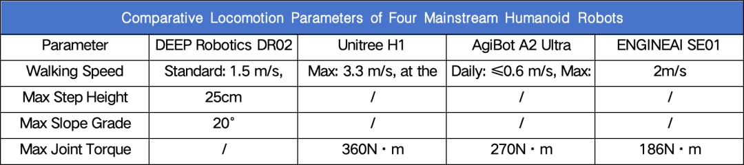 此外,尽管 Unitree H1、AgiBot A2 Ultra 和 ENGINEAI SE01 缺乏明确的越障参数(可能需要在楼梯或斜坡上进行人工辅助),但 DEEP Robotics DR02 可以自主跨越 25 厘米高的台阶和 20° 的斜坡。这一能力使其能够在工厂、仓库和户外等各种地形上独立运行,稳定地执行巡检和运输任务,显著扩展了其在非结构化环境中的作业范围。