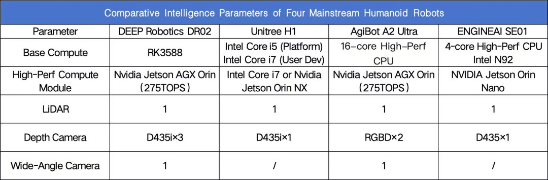 相比之下,Unitree 的 H1(70-100 TOPS)和 ENGINEAI SE01(34-67 TOPS)的计算能力略低,但仍然能够处理日常生活和研究环境中中等复杂程度的感知和交互任务。