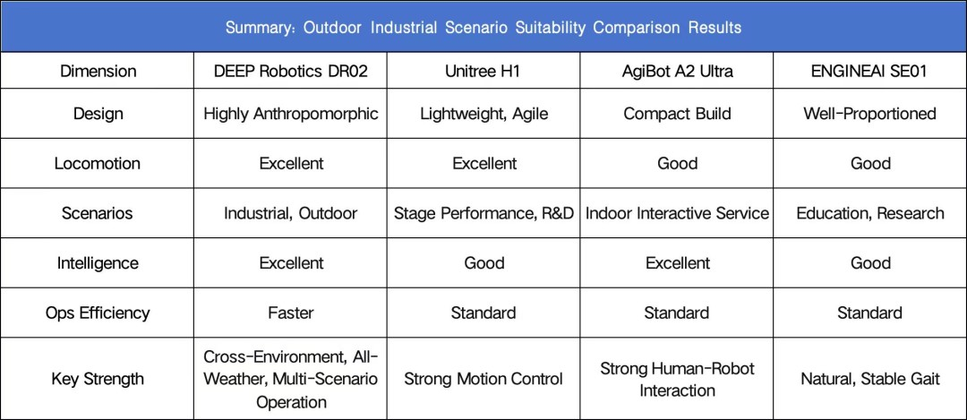 对比结果凸显了不同场景下的显著优势:Unitree H1 在动态性能方面表现卓越,以冠军级冲刺速度(2025 年机器人大赛)傲视群雄;AgiBot A2 Ultra 凭借高语音识别率优化了交互体验;ENGINEAI SE01 以优异的性价比提升了科研应用的普及性。然而,DEEP Robotics DR02 凭借其 IP66 防护等级、-20°C 至 55°C 的耐温范围以及模块化维护设计,脱颖而出,成为首款真正适用于户外工业场景的产品,为工业应用的可靠性树立了新的标杆。
