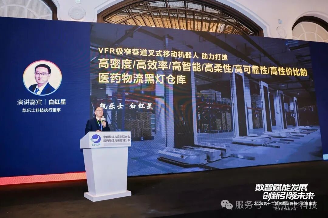 在广州医药物流年会上,凯乐士科技执行董事、人工智能研究院院长白红星首次系统阐释《高密度、高效率、高智能、高柔性、高可靠性、高性价比的医药物流黑灯仓库》理念,并揭秘VFR机器人在黑灯工厂中的创新应用。