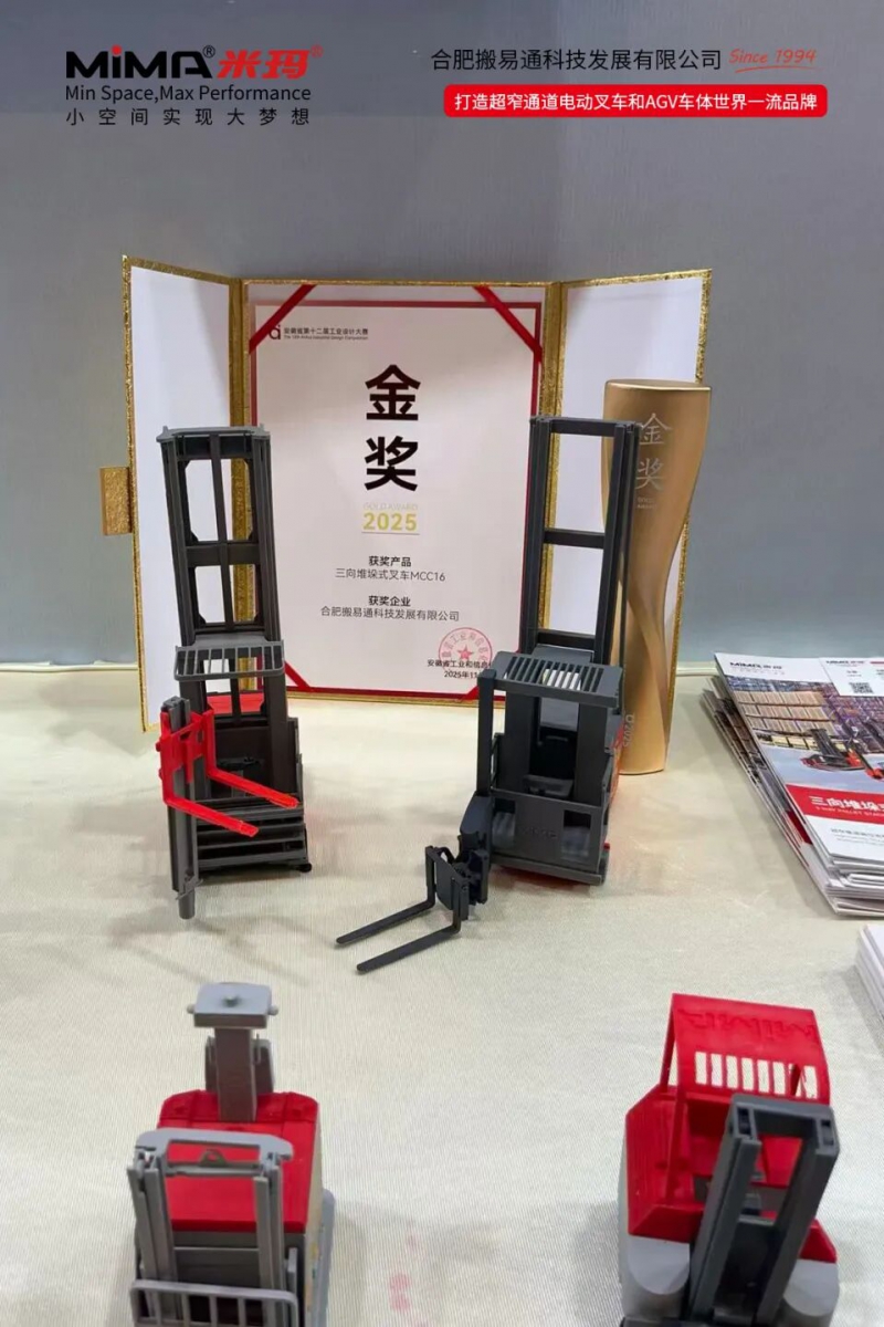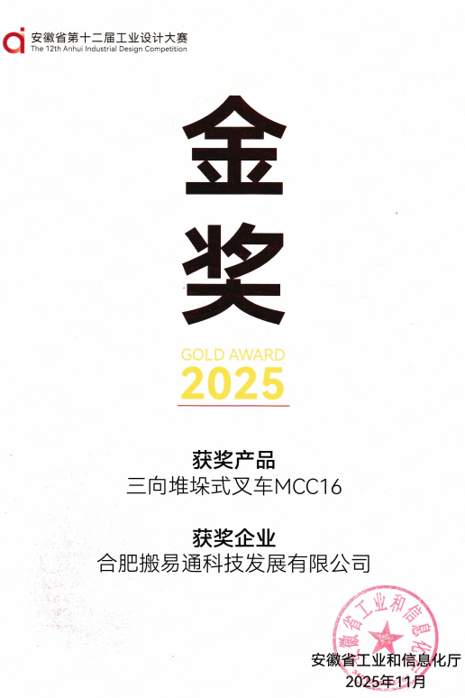 近日,11 月 27 日上午,安徽省第十二届工业设计大赛颁奖大会暨展览展示活动在合肥丰大国际大酒店隆重举行,备受关注的大赛获奖名单也同步揭晓。合肥搬易通科技发展有限公司自主研发的人上型三向堆垛式叉车 MCC16 凭借卓越的创新设计、硬核的产品性能与广泛的应用价值,从众多参赛作品中脱颖而出,成功摘得金奖!这一荣誉不仅是对产品设计的高度认可,更是对公司三十余年深耕电动叉车领域创新实力的有力印证。