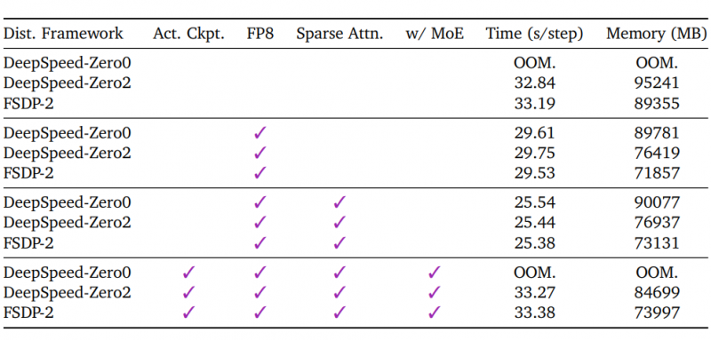 实验数据显示,FSDP-2 分布式框架结合 FP8 精度,在 8 卡 H20 GPU、批量大小 32 的配置下,可实现高效训练,且稀疏注意力机制的引入进一步提升了训练与推理效率,让大模型训练不再依赖超大规模算力集群。