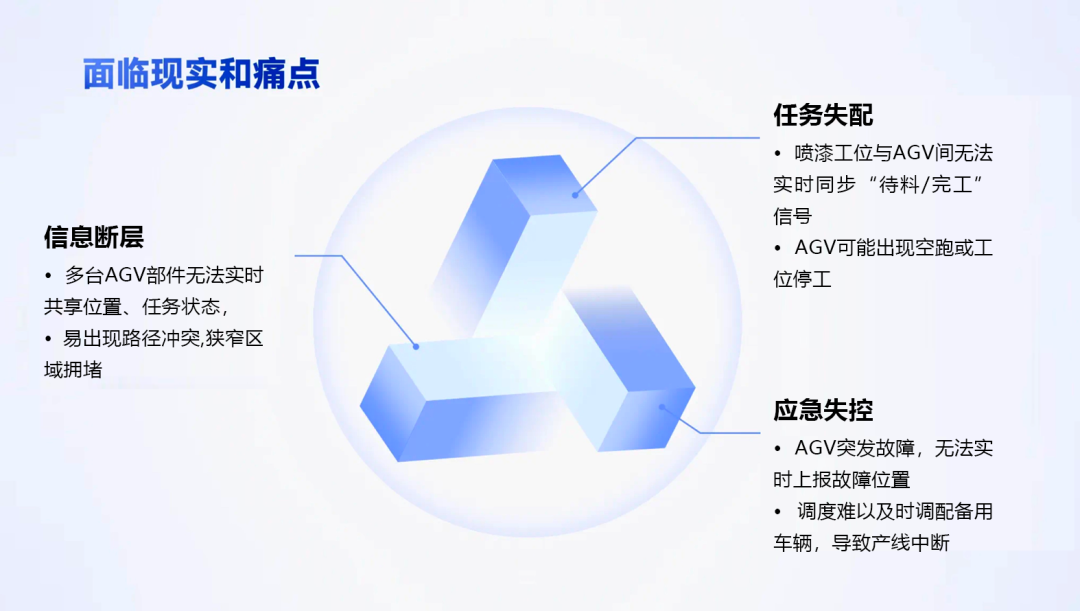 在装配喷漆产线项目中,航空部件属于涉密物资,车间需严格遵守保密规定——所有设备禁止接入外部网络,且内部通讯需采用加密离线模式。这一限制导致传统依赖实时在线传输的AGV调度系统完全失效,具体面临三大难题: