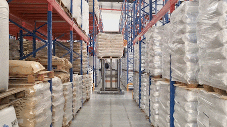 此前使用传统的平衡重叉车进行货物运输,需要经过多次转向才能完成存取货物动作,耗费时间长。