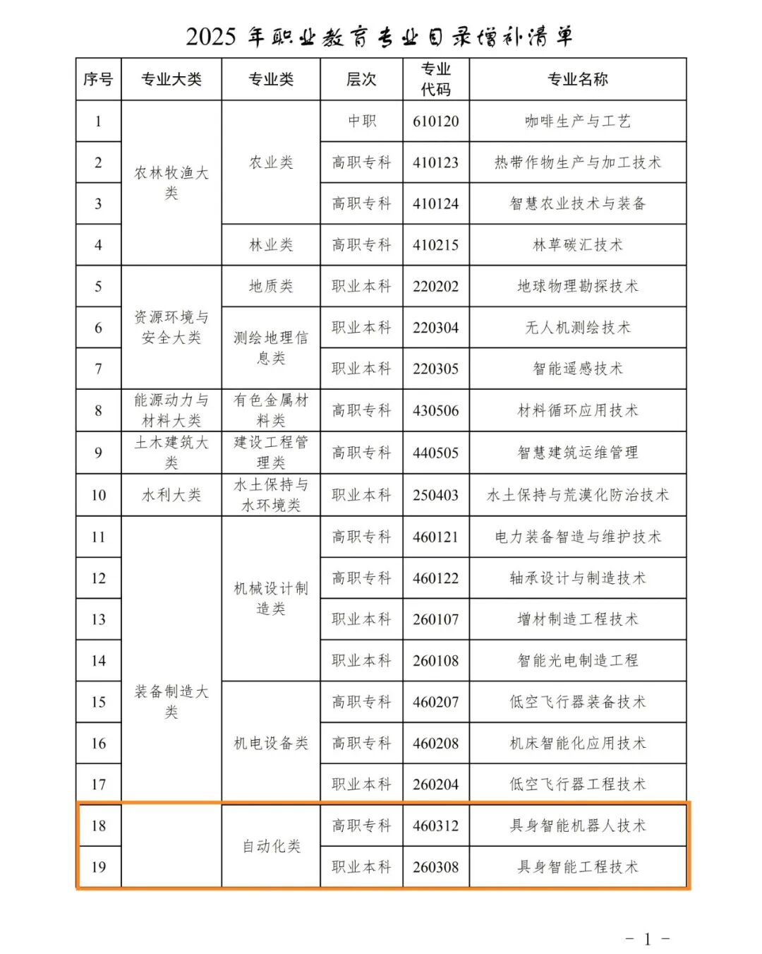 近日,教育部办公厅正式印发《关于做好2026年职业教育拟招生专业设置管理工作的通知》(教职成厅函〔2025〕27号),同步公布《2025年职业教育专业目录增补清单》。清单明确在“装备制造大类—自动化类”下增设高职专科专业“具身智能机器人技术”(专业代码460312)及职业本科专业“具身智能工程技术”(专业代码260308)。