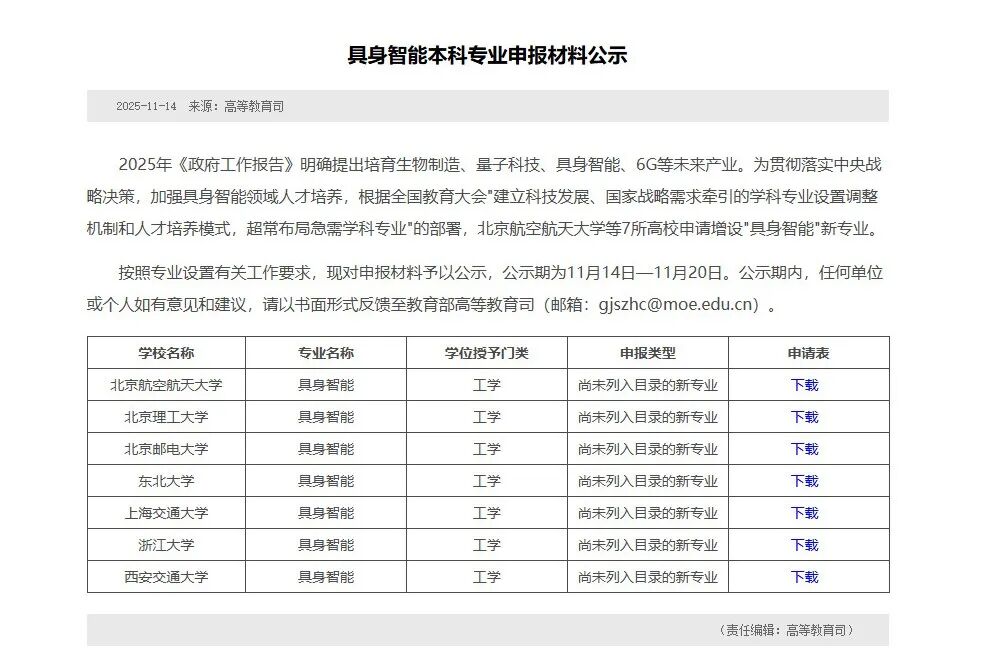 为此,高等教育层面的具身智能专业布局也在同步推进。近日教育部发布的《具身智能本科专业申报材料公示》显示,北京航空航天大学、浙江大学、西安交通大学等7所高校已集中申报“具身智能”本科专业,将依托各校优势学科开展特色化高端人才培养,从不同技术路径切入具身智能领域。