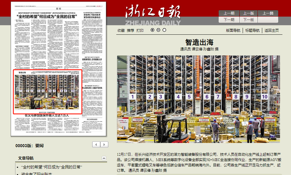 临近年末,诺力智能工厂各生产线正全力以赴、高效运转,以“开足马力”的奋斗姿态,全力冲刺年度目标任务。就在今天,公司智能化生产实景登上《浙江日报》,以“智造出海”为主题,展现了诺力在高端制造与绿色科技领域的硬实力。