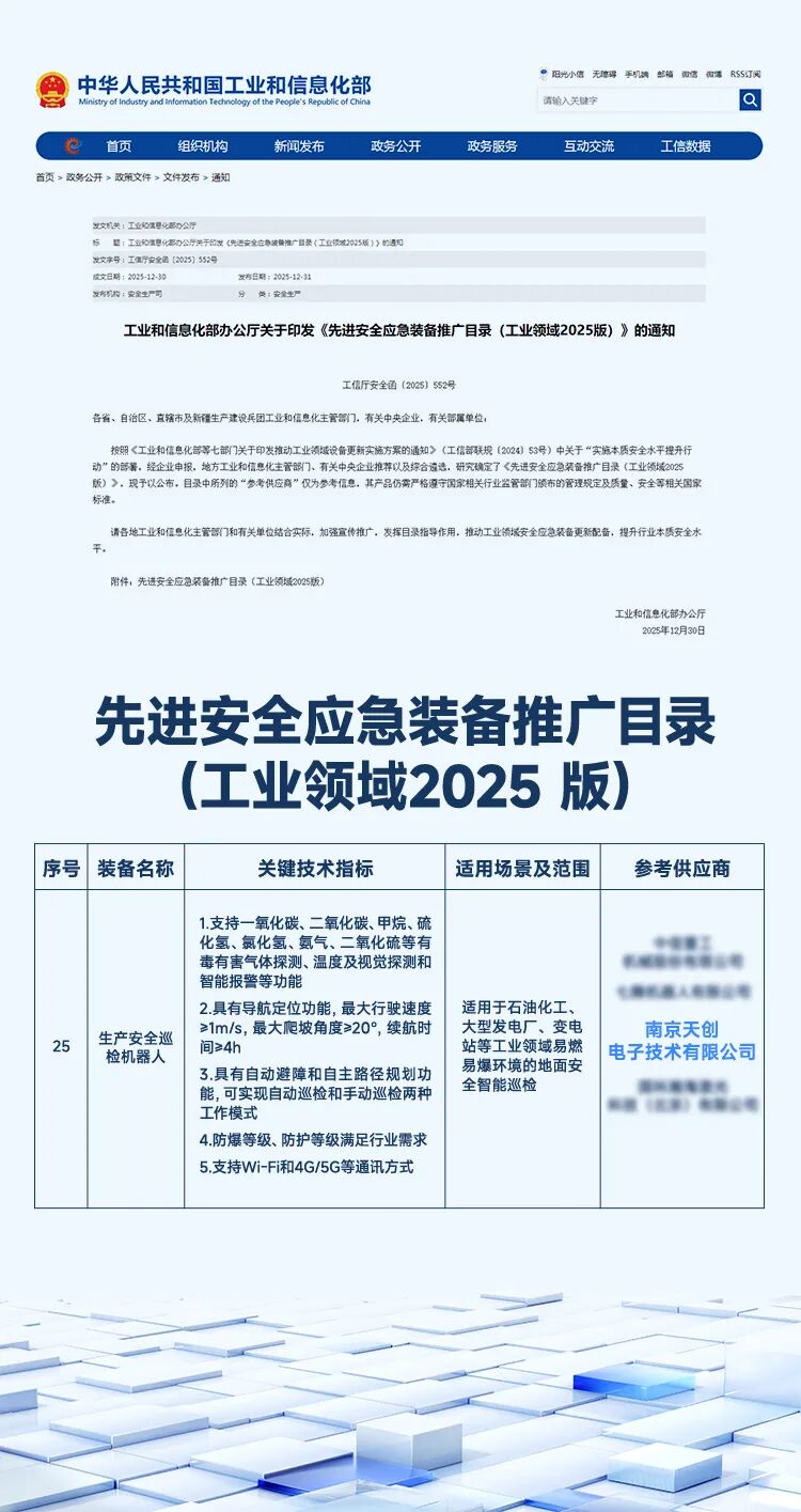 本次入选国家级推广目录,是对天创机器人在工业安全领域技术创新实力的高度认可,公司将以技术创新驱动巡检机器人系列产品持续升级,为提升工业、能源行业巡检运维场景的本质安全贡献力量。
