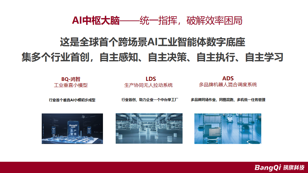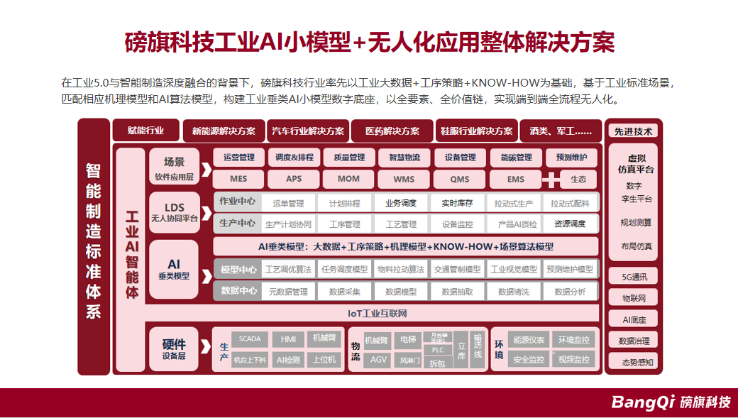 连续中标三大海外项目,是磅旗科技“出海战略”加速落地的有力印证。自创建以来,磅旗科技始终以 “让全球制造都智能起来” 为使命,依托自主构建的工业垂类AI小模型数字底座,打造 “AI+软件+硬件+服务”一体化解决方案,业务覆盖智能制造、智慧物流、智慧云仓、数字能源和智慧园区等全栈式AI无人化数字服务,致力于推动全球工业智能化进程。