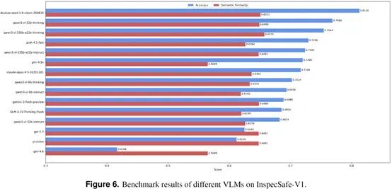 研究团队基于InspecSafe-V1设立了标准化的安全评估基准任务,用于衡量现有通用视觉-语言大模型在复杂工业环境下的理解与推理能力。