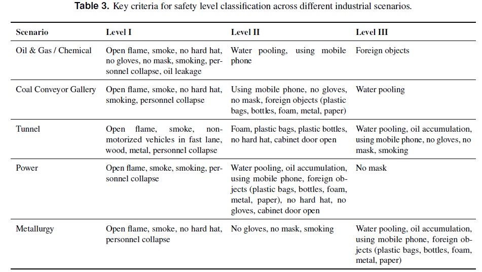 安全等级标签:依据行业安全规范,将场景安全分为I级(高风险)至 IV级(无异常)。例如,在石油化工场景中,“明火”、“烟雾”、“人员倒地”被定义为I级风险。