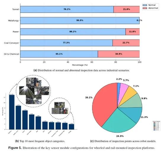 研究团队摒弃了传统的固定机位采集方式,直接将数据采集前端部署于41台正在实际服役的轮式与轨道式巡检机器人上。这些机器人穿梭于隧道、电力设施、冶金烧结、石油化工、输煤栈桥这五大典型工业场景中,从2239个有效巡检点收集了5013个巡检实例。