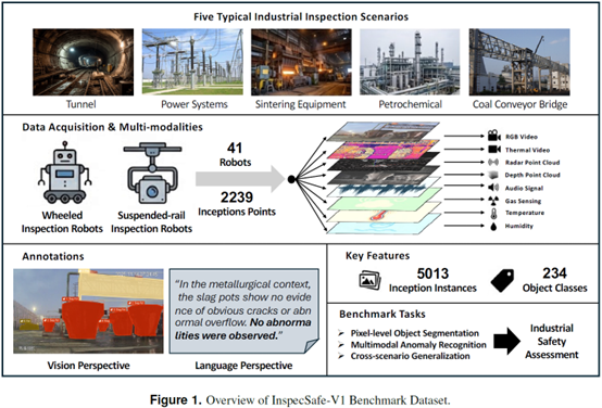 工业智能和无人巡检发展迅猛,但AI如何在复杂、危险且动态变化的真实工厂环境中可靠地“看”懂场景、评估安全,仍是阻碍其大规模落地的核心瓶颈。现有公开数据集大多来自仿真环境或静态近景拍摄,缺乏真实扰动、多模态对齐和细粒度的安全语义标注,导致训练出的模型“纸上谈兵”,在实际部署中频频失效。