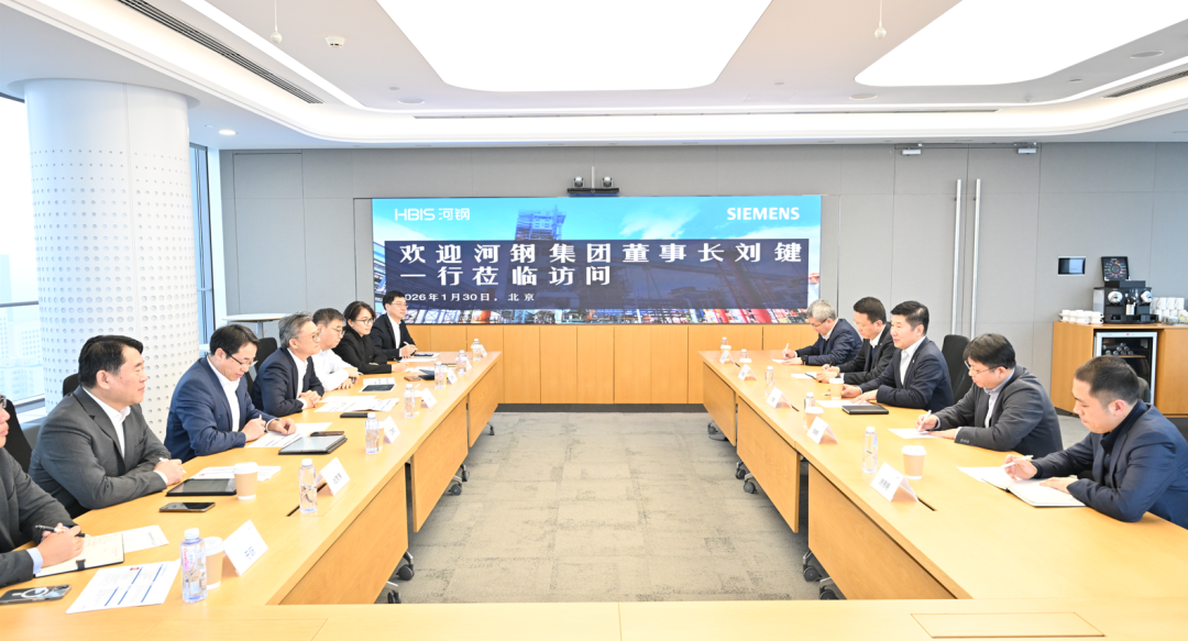1 月 30 日,河钢集团董事长刘键一行到访西门子中心(北京),与西门子全球执行副总裁、西门子大中华区总裁兼首席执行官肖松博士及其管理团队进行会谈。双方着眼钢铁行业发展趋势,聚焦智能化发展、绿色转型、全球布局、人才培养等话题进行了深入交流,并期许双方务实合作再上新台阶。