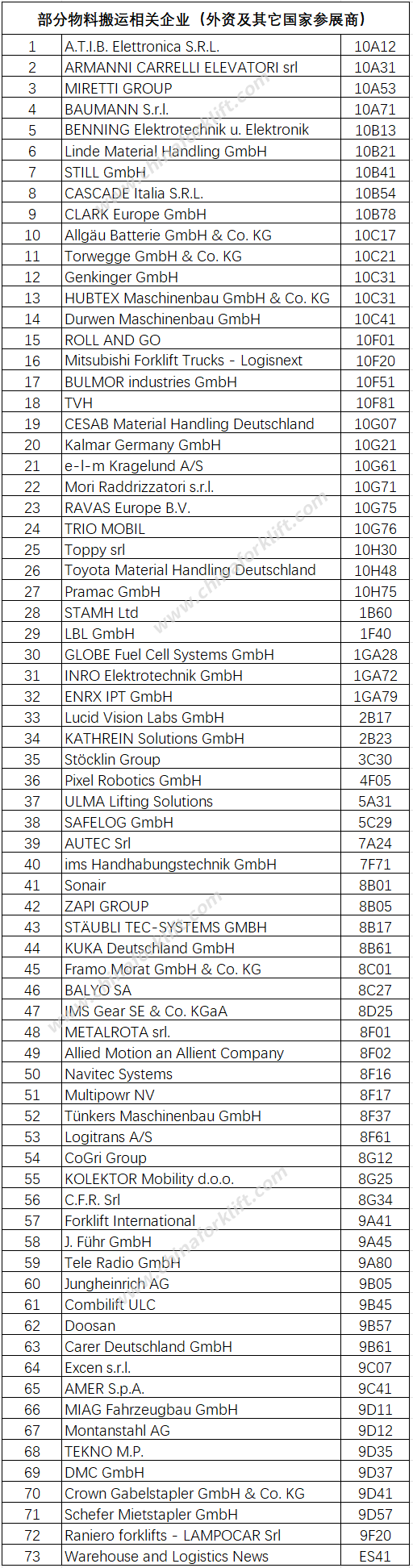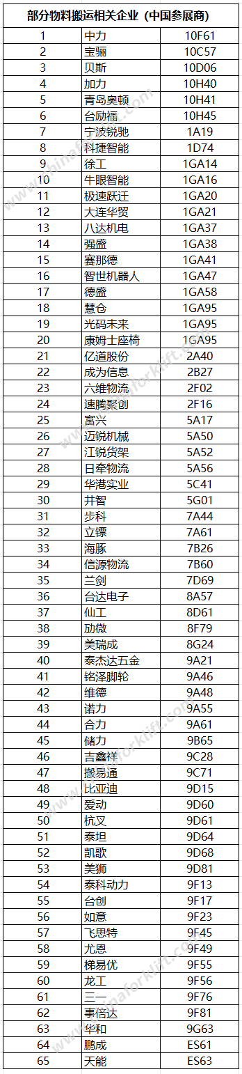 以下为部分物料搬运相关企业(包括中国参展商、外资及其它国家参展商)(排名不分先后)