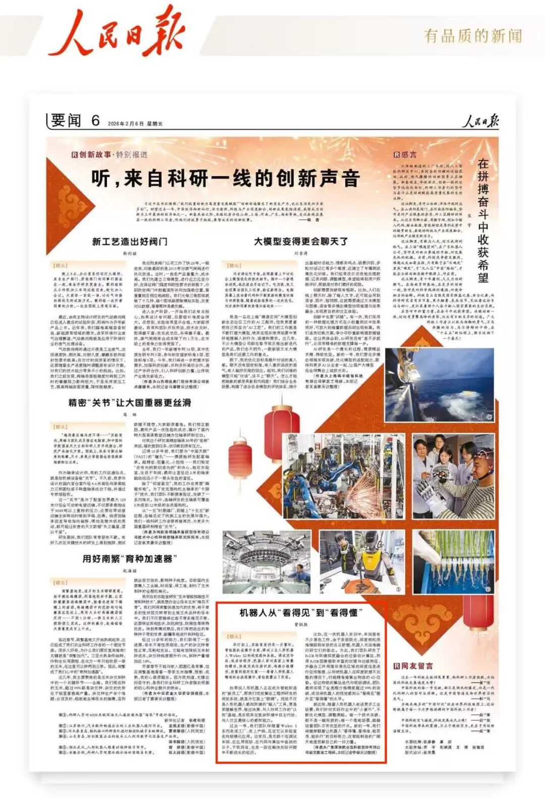 2月6日,《人民日报》要闻版刊登2026新春走基层系列特别报道——《听,来自科研一线的创新声音》。继1月18日登上《人民日报》“十五五”系列报道后,优必选视觉算法工程师曾钰胜再次作为人形机器人行业的杰出青年代表接受《人民日报》专访,向记者讲述了他在2025年奔赴产业一线,扎根中国智能制造的故事。