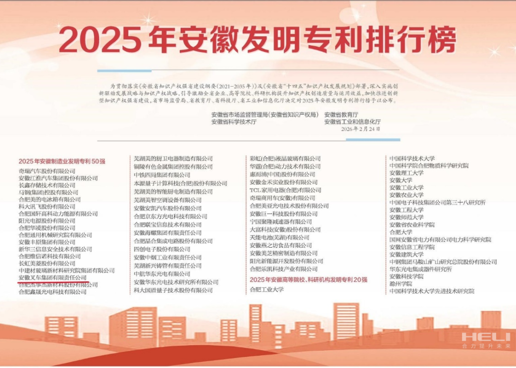 近日,安徽省市场监督管理局(安徽省知识产权局)、安徽省教育厅、安徽省科学技术厅、安徽省工业和信息化厅联合发布“2025年安徽发明专利排行榜”,安徽叉车集团凭借卓越的创新能力与知识产权优势,成功入选安徽省制造业发明专利50强。