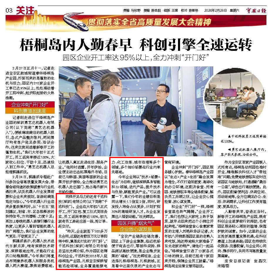 “开工即签下500多万元合同,近期还有数百万元订单即将中标,实打实迎来‘开门好’。”千巡科技市场总监汪光辉介绍道。作为2018年入驻梧桐岛产业园的老牌科创企业,千巡科技扎根宝安,深耕智能巡检领域,业务覆盖能源电力、化工冶炼、城市治理、智能制造等多元领域,多个细分场景实现行业率先落地,凭借硬核技术稳稳立足市场。