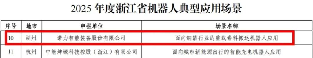 近日,浙江省经济和信息化厅正式发布了《关于公布2025年机器人典型应用场景和“机器人+”应用标杆企业的通知》,诺力智能装备股份有限公司凭借“面向铜箔行业的重载卷料搬运机器人应用”项目,成功入选2025年度浙江省机器人典型应用场景!