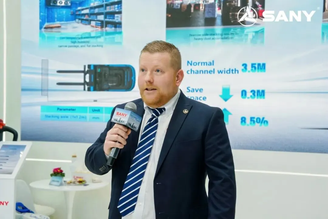 3月24日上午,在多方见证下,SCP16/20S三支点锂电平衡重叉车在欧洲重磅首发。三一机器人欧洲高级营销经理Michael将其誉为“窄通道精灵”与“冷库搬运专家”。凭借卓越性能及领先的智能安全技术,该新品迅速成为全场焦点。