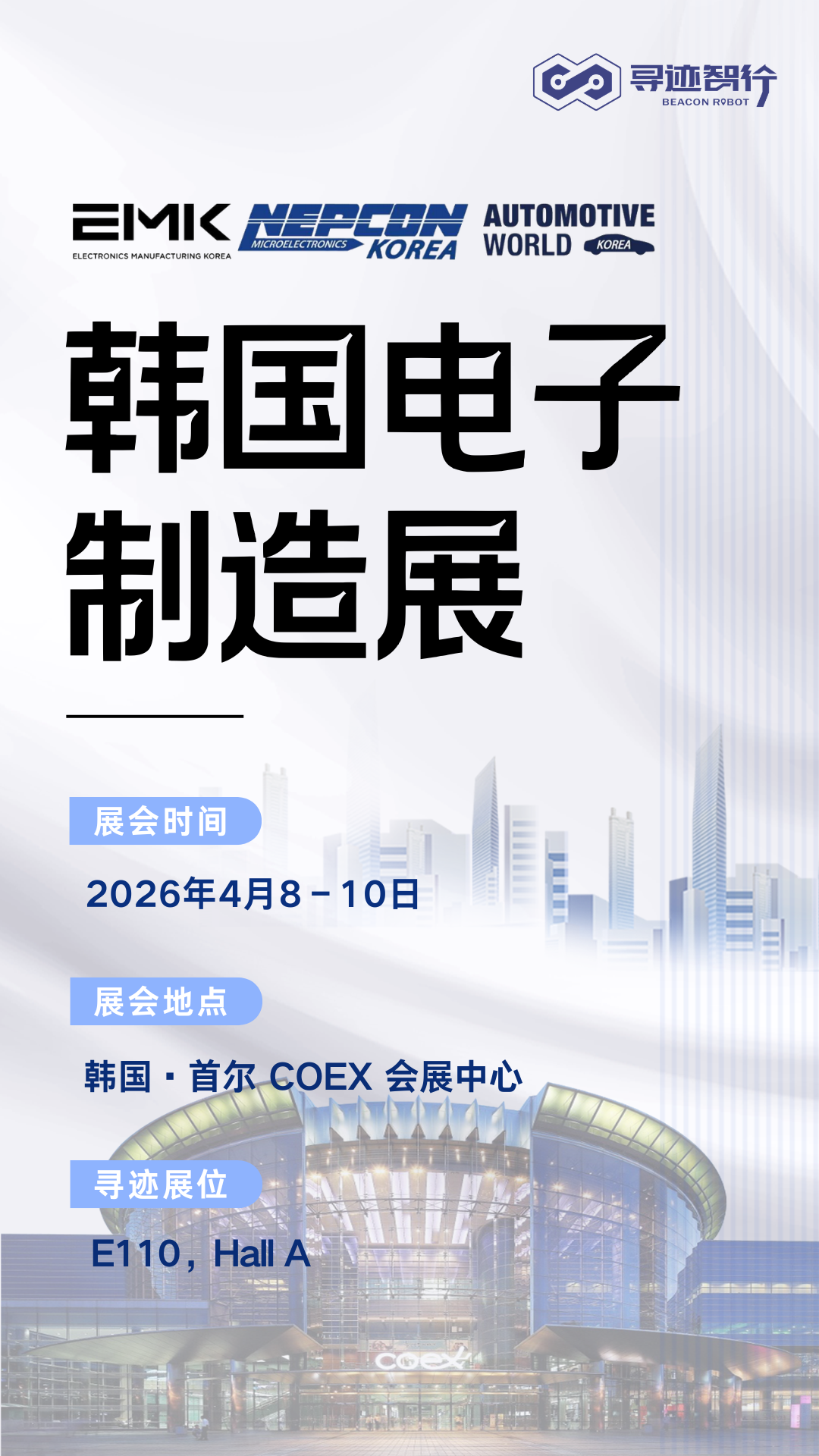 - 展会预告|4月8日-10日,寻迹智行Beacon Robot邀您共赴韩国电子制造展
