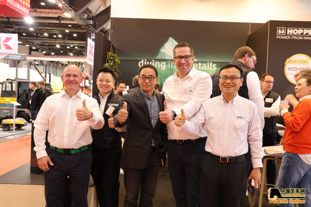 合影(右一:荷贝克动力电源总监刘富唐;左三:中叉网/AGV网总经理胡扬波)