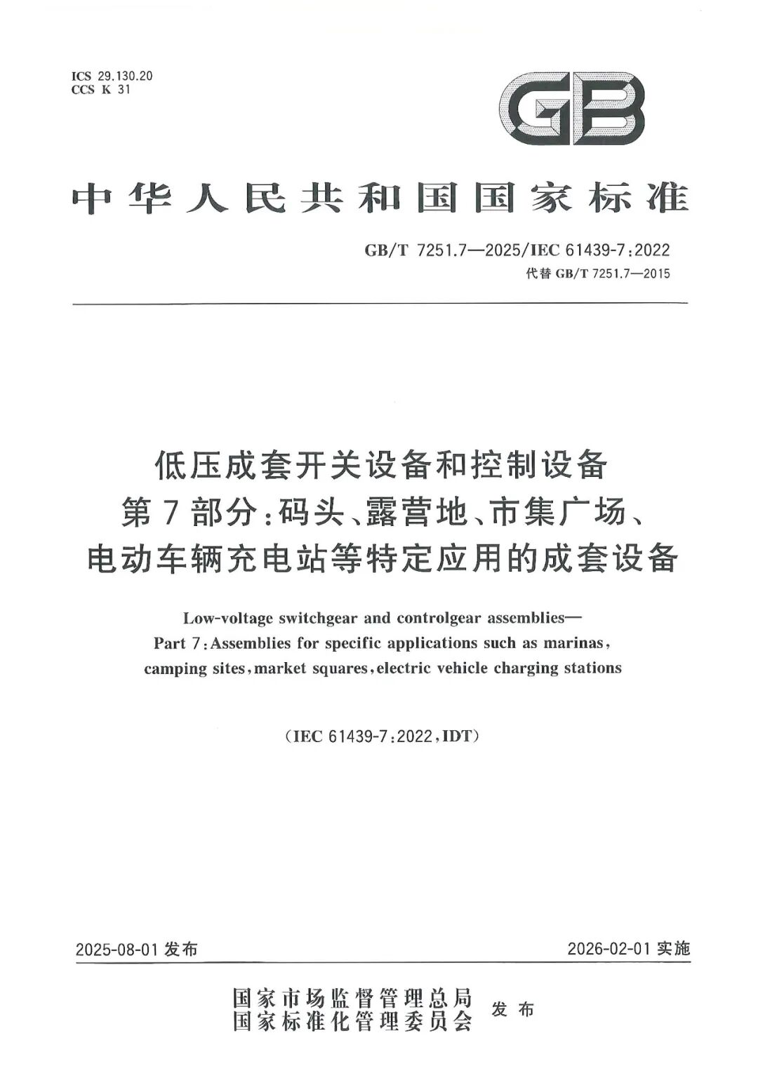 本次安德普作为主要起草单位参与制定的国家标准为 GB/T 7251.7-2025/IEC 61439-7:2022《低压成套开关设备和控制设备 第7部分:码头、露营地、市集广场、电动车辆充电站等特定应用的成套设备》。该标准于2025年8月1日发布,2026年2月1日实施,为包括电动车辆充电站在内的特定应用场景的低压成套设备,提供了全面的安全、结构与性能要求。