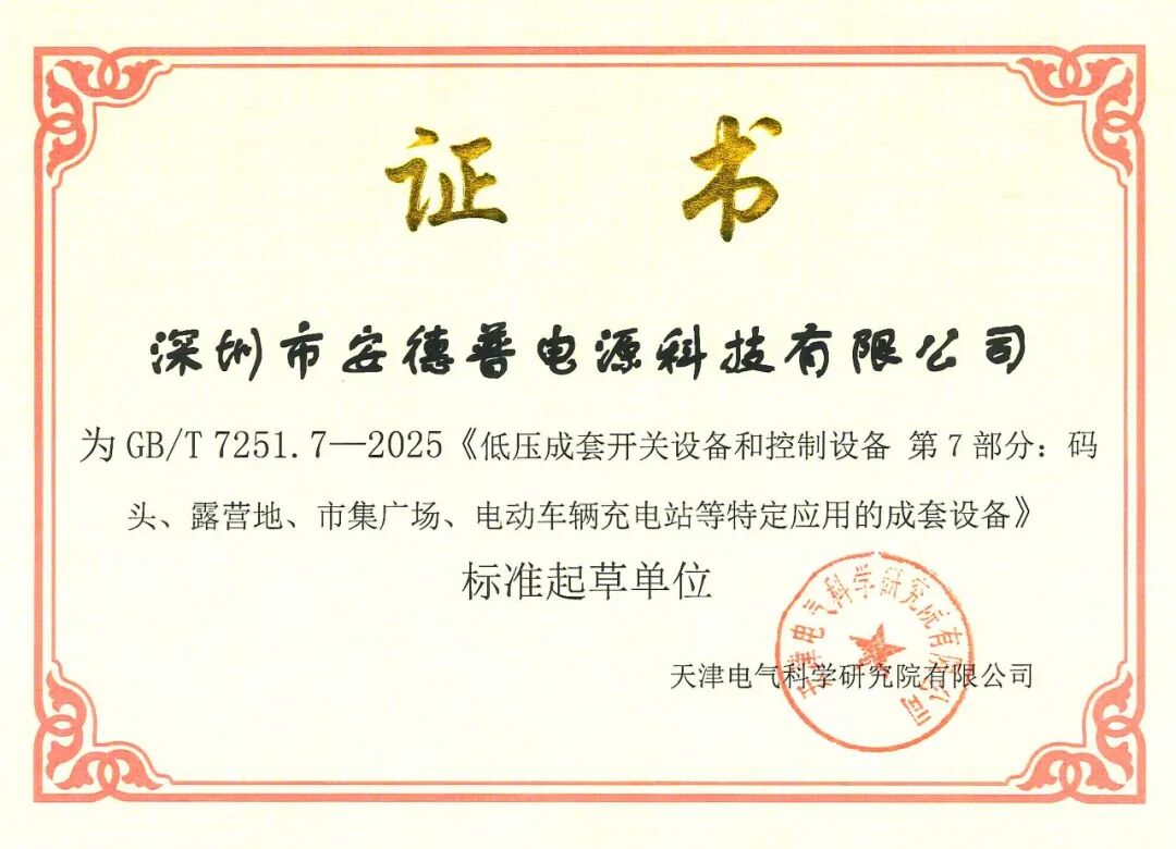 在智慧能源与绿色物流迅猛发展的时代浪潮中,技术标准已成为产业高质量发展的核心引擎。深圳市安德普电源科技有限公司(以下简称“安德普”)凭借在工业车辆充电领域的深厚积淀与技术创新,于2025年荣膺“国家标准起草单位”称号,深度参与了国家标准GB/T 7251.7-2025的制定工作。这不仅是国家权威机构对安德普技术实力与行业贡献的高度认可,更标志安德普在从产品创新到标准定义的道路上迈出了关键一步,正以“标准之力”赋能全球智慧能源产业的规范化与可持续发展。