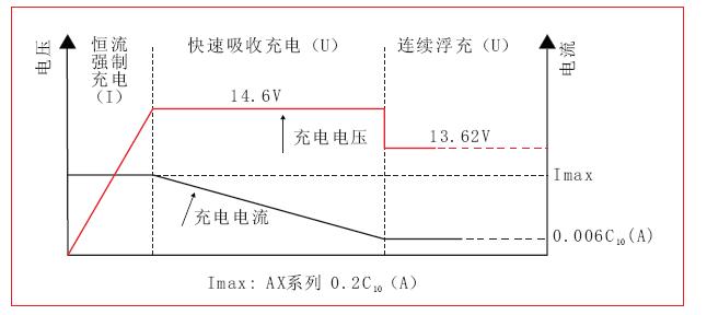 推荐使用 IUU三步充电法:即第一步恒流充电后,跟着二步不同电压的恒压充电,直至充电电流降到0.006C10(A)以下保持不变时,视为已充满电。环境温度25℃时,电流和电压的设置如下图所示: