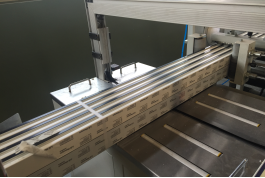 打包捆扎好的型材经传送带传送到套袋机中,自动套袋并横向纵向封切。
