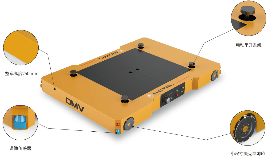 整车采用超低结构设计,高度仅为 250mm,利用麦克纳姆轮实现零回转半径、侧移、全方位无死角移动。可方便的潜入各类工件托盘下。穿行于托架之间、在狭小空间内全方位无死角任意漂移。通过加装电动举升系统,即可实现整体搬运各种工装及部件。实现对接、装配等复杂工作。