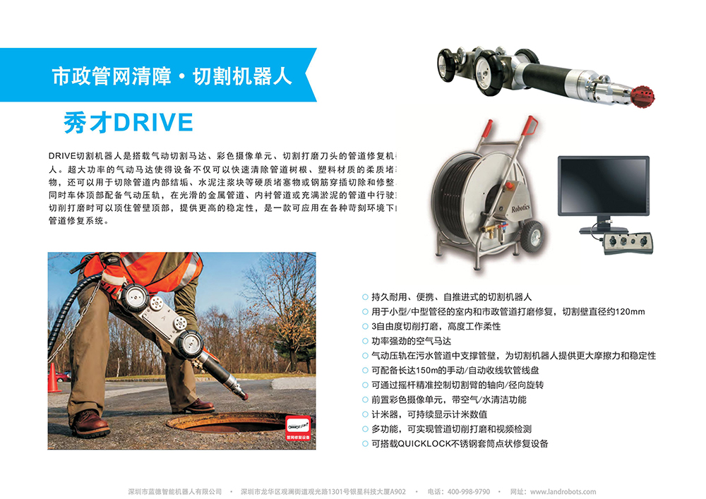 非开挖修复处理方案“管道切割机器人”,www.landrobots.com蓝德智能机器人向市面共推出3款管道切割机器人,型号分别为:LD-80Q、LD-150Q、LD-200Q、分为针对管径为:DN80-250/DN150-600/DN200-800的市政排水管道,可进行管道堵塞切除、密封性能测试、CCTV视频检测等功能。