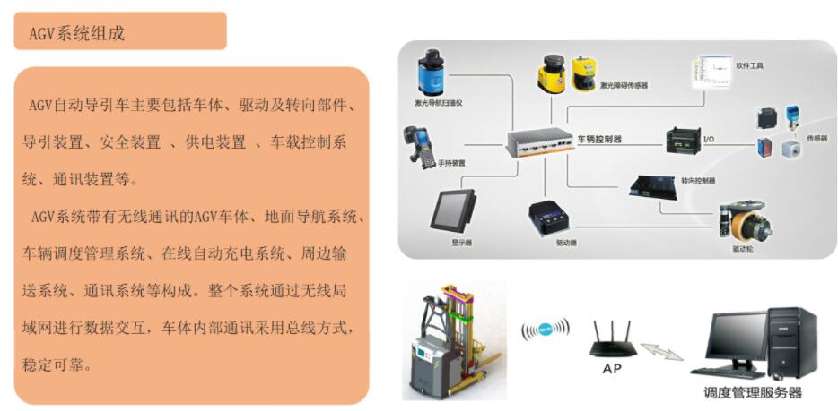 AGV托盘堆垛车是指带有无线通讯的AGV车体、地面导航系统、车辆调度管理系统、在线自动充电系统、周边输送系统、通讯系统等构成。整个系统通过无线局域网进行数据交互,车体内部通讯采用总线方式,稳定可靠。