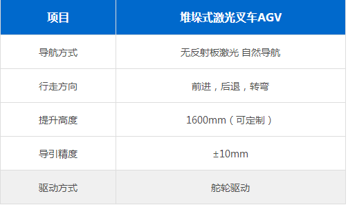 堆垛式激光叉车AGV,用于不同高度平台上的托盘类物料的物流周转,由自然环境激光导航系统、舵轮牵引和转向驱动系统、液压升降系统、安全系统、电源系统等组成,具有导航精度高、性能可靠、性价比高等特点。可广泛应用于汽车、家电、电子、新能源、仓储、医药、电力等行业