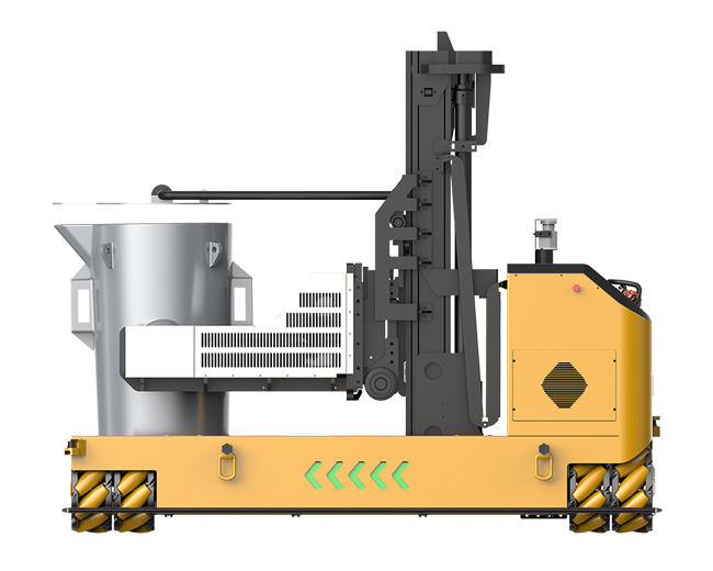 OMV铁水转运车到达指定浇注点后,可举升到合适的高度和角度,自动倾倒铁水,当铁水包里的铁水出现品质问题或其他问题需要倾倒时,可通过遥控等方式将包内铁水倾倒至废铁水框内,车身四周设有安全触边、对角设有激光避障传感器,当扫描到障碍物,通过报警、减速、停止三个阶段进行整车防护,安全、省力,有效避免安全事故的发生。