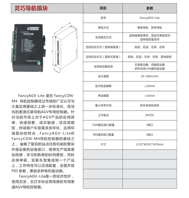 FancyAGV-Lite是在FancyAGV核心控制器经过市场的广泛认可与大量应用基础的之上进一步标准化、简洁化的差速式磁导航AGV专用控制器,是天津佳创博为科技有限公司开发的又一款拳头产品。 针对当前市场上对于AGV产品的简单应用、快速部署、成本敏感的需求,抑或部分客户对AGV产品经验较少、技术精力有限的情况,以及某些终端客户车型需求多样化、应用环境复杂的特点,FancyAGV-Lite在FancyAGV的基础之上,省略了复杂的站点任务机制和繁杂外围设备的设备接口,使得生产组装更加简便,学习和熟悉的时间更短,同时还将单驱、双驱车型集成到一个产品上,工作特性可以灵活配置,全面开放PID参数,兼容多种电机驱动器。