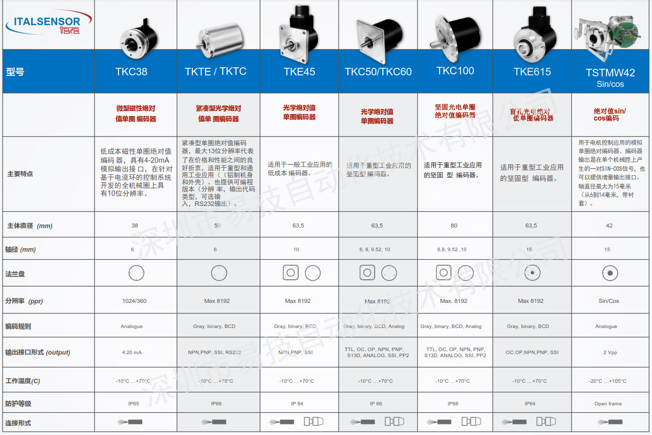 ITALSENSOR有种规格类型的增量式和单圈多圈编码器,直径25~80mm,高分辨率, 高防护等级IP67,适应多种输出方式,既有应用于一般工业的低成本的编码器,也有带EtherCat技术,Profinet的多圈可编程编码器,广泛应用于金属加工,木工、包装、食品、印刷、升降机、电机等行业。