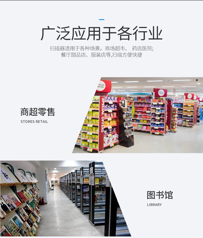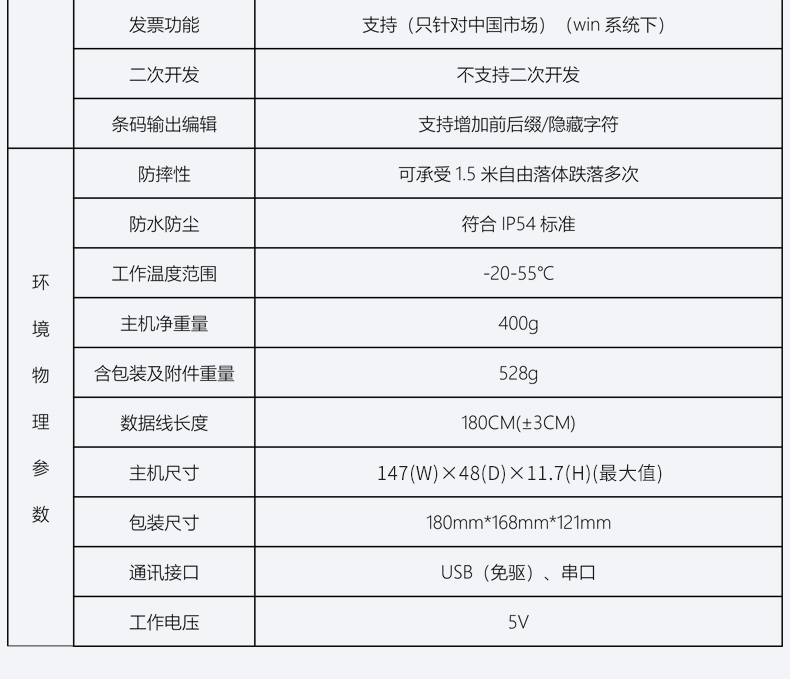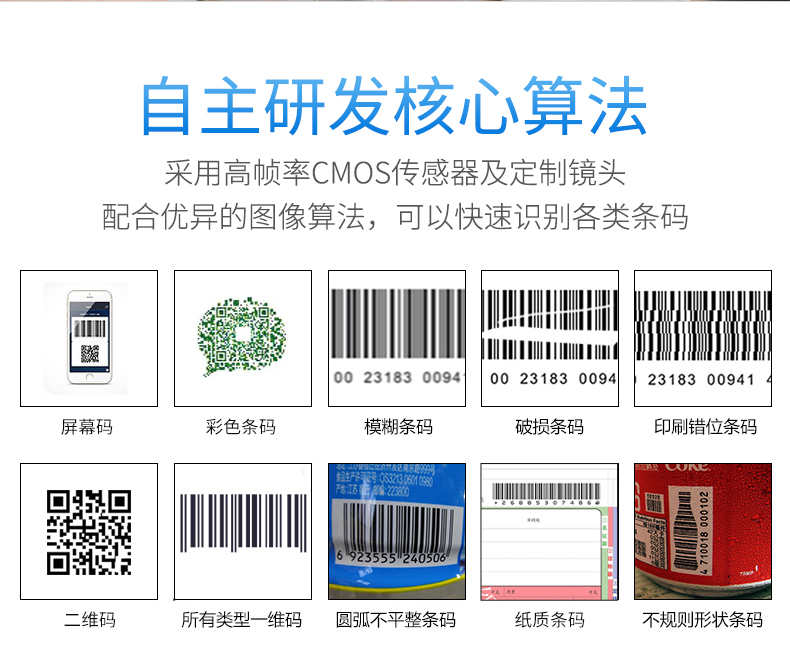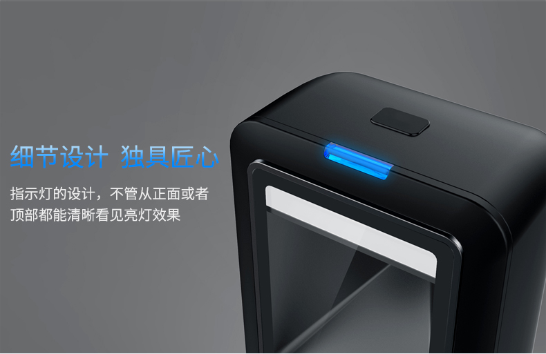 采用32位主控芯片搭载专利软体,可顺畅解读反光、打皱、模糊、彩色条码,强光及暗光环境下也可正常解码。